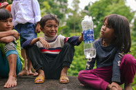At the lake, we saw a boy washing his cow. He looked at Zach and me with confusion and as we headed down towards the water and took out our water bottles, that look of confusion quickly turned to concern. He came over to us, waving his hands telling us to stop. I smiled at Zach, at started filling up my bottle with the brown water. Suddenly a group of kids emerged, all watching what we were doing. I filled the bottle, screwed on the filter. I squeezed the bottle and crystal clear water poured out! Now it was time to prove it!